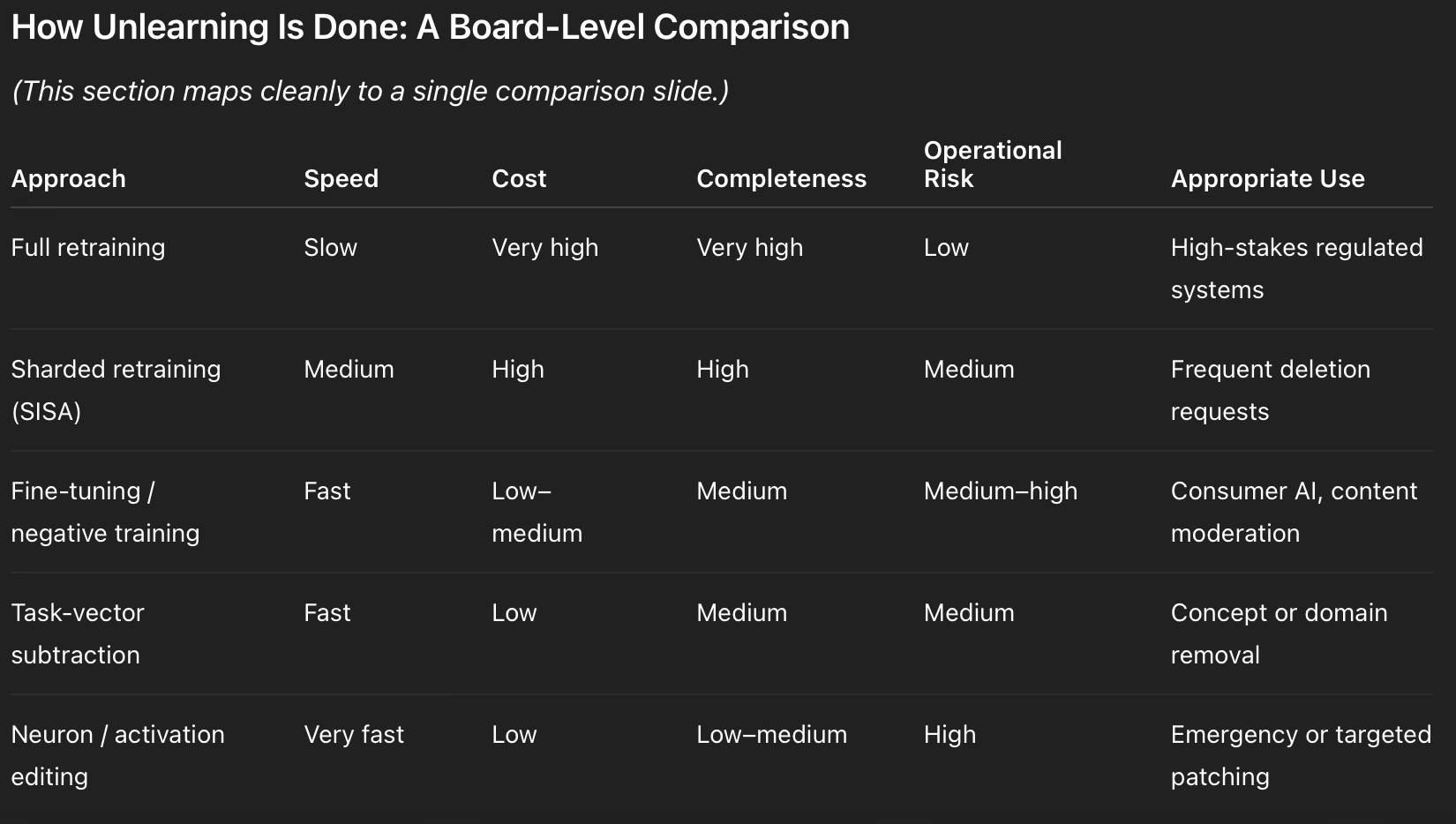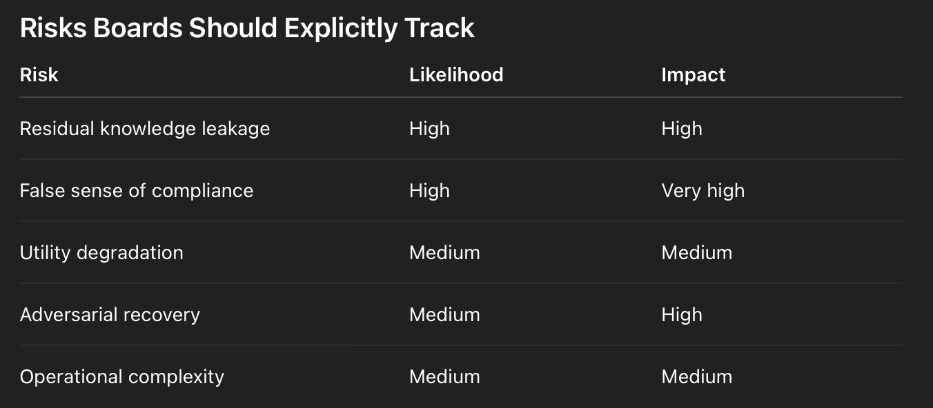 Boards should therefore focus not on whether unlearning is “perfect,” but on whether it is defensible, auditable, and proportionate to risk.